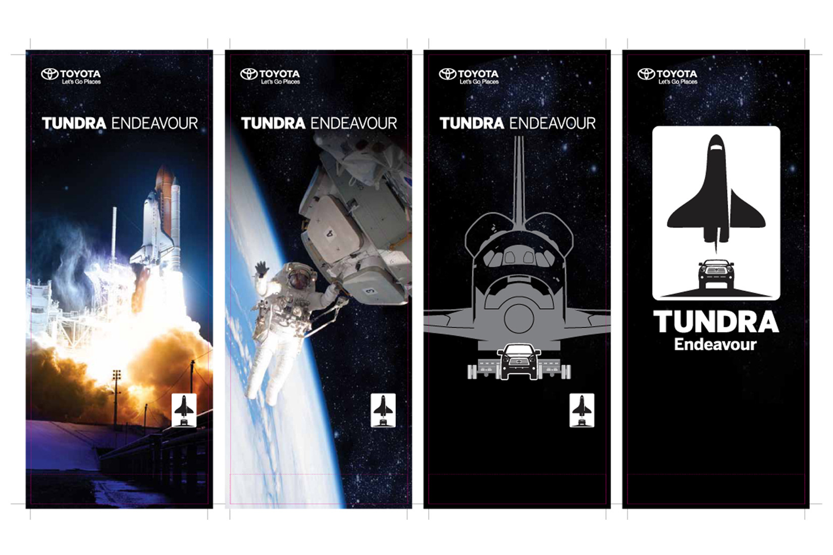 When the Endeavor Space Shuttle made its historic last journey, Kern & Crop was there. In conjunction with the Toyota Motor Company, Saatchi & Saatchi and AMCI Global, Larissa Tootla developed the graphics, signage, and banners at the Toyota Pavilion where executives and VIPs could view the shuttle’s progress as it made its way through the streets of Los Angeles. At the final leg, the Endeavor was connected to a Toyota Tundra and pulled over the 405 interstate for a thirty second Super Bowl ad, breaking the world record for towing capacity. After the journey and VIP event was complete, Toyota requested that the Pavilion back wall signage be transported to its Tundra plant in San Antonio, Texas, where it currently is showcased.